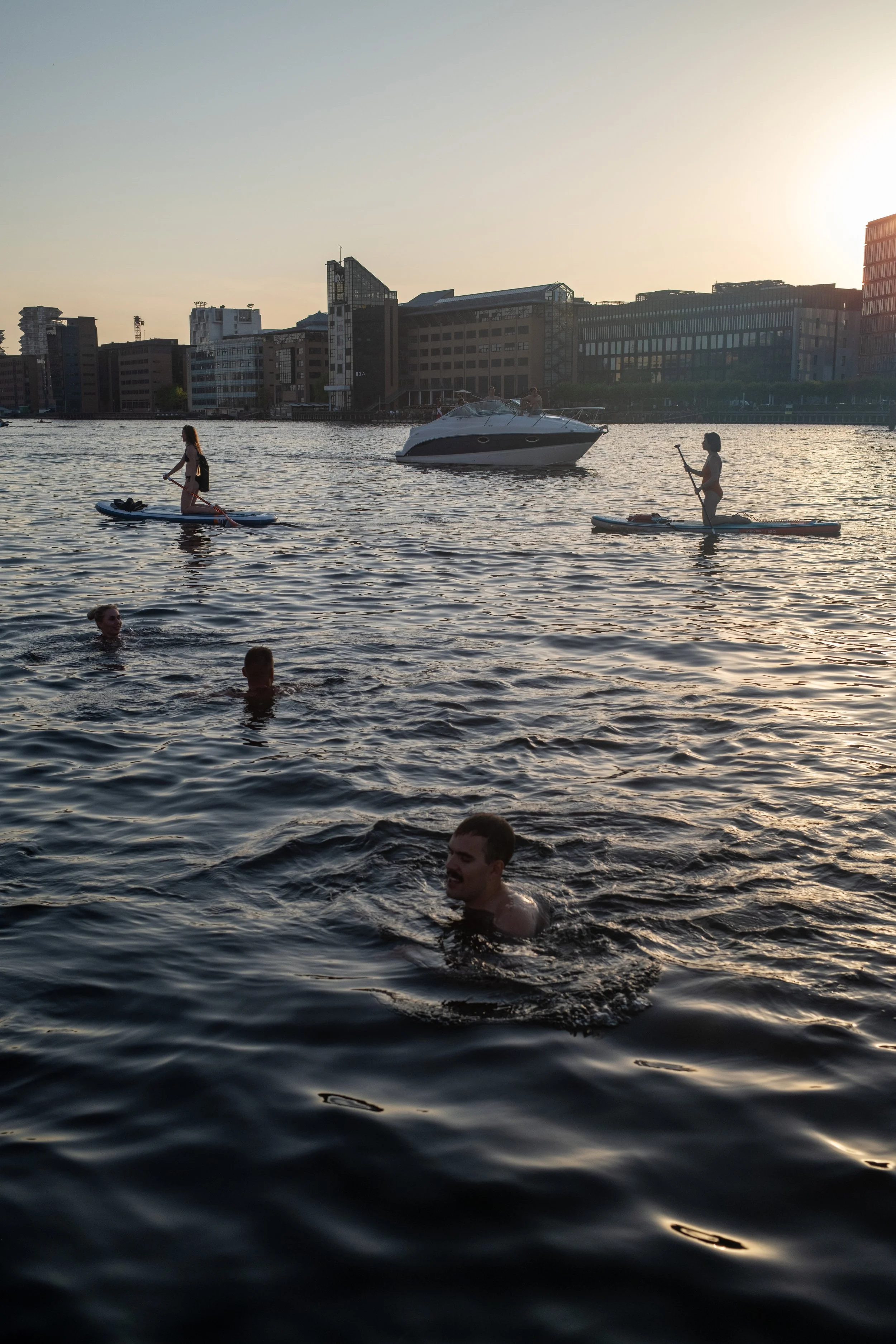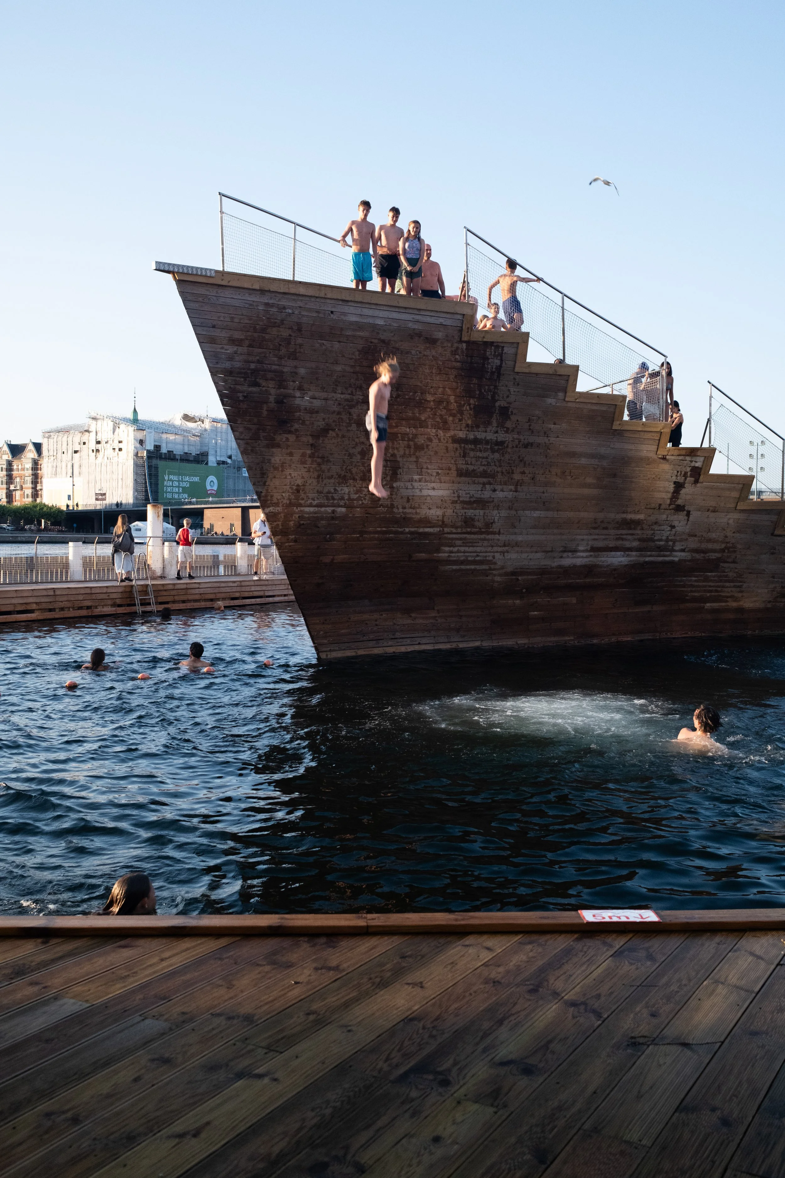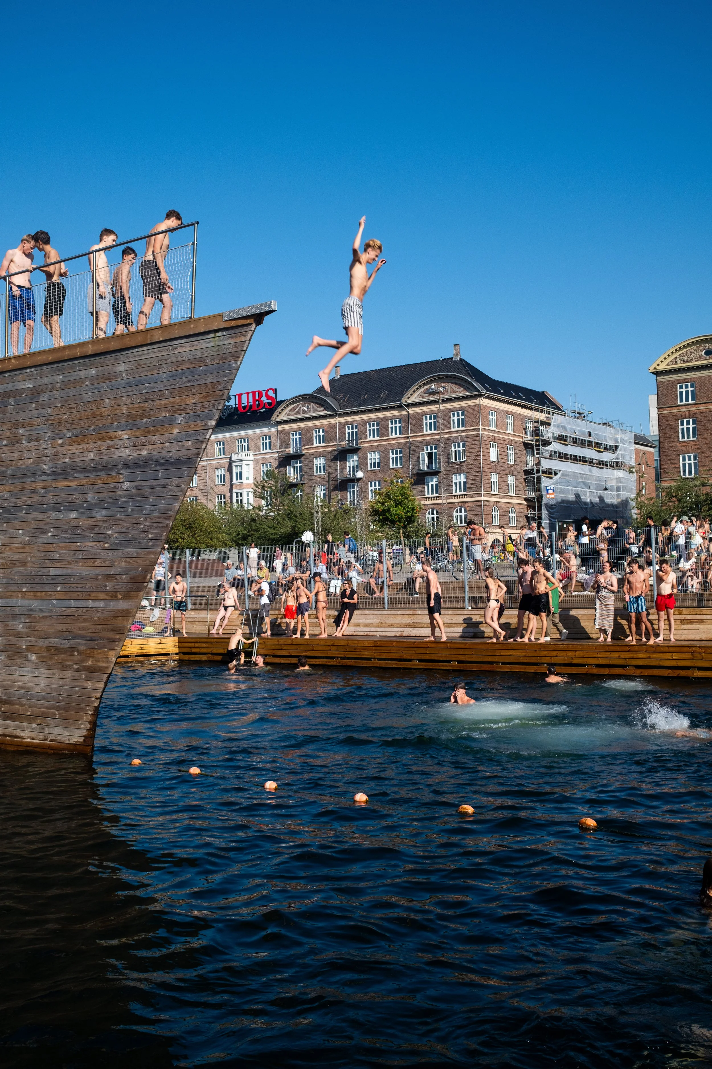 SchwimmenIm Sommer ist das Wasser im Kopenhagener Becken maximal 22 Grad warm. Die Luft ist häufig kälter, nicht zu vergessen der Wind. Wenn der mal nicht weht ist es fast keine Mutprobe mehr einen Kopfsprung zu machen.